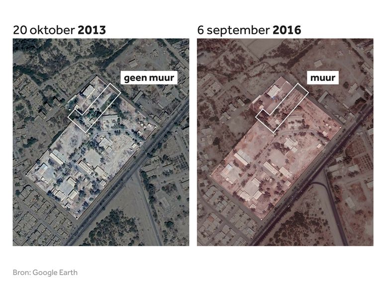 La escuela, que también fue destruida, linda con el complejo militar. Las imágenes históricas de satélite también muestran que el edificio de la escuela alguna vez fue parte de este complejo, pero que ha estado separado del sitio por un muro desde 2016.