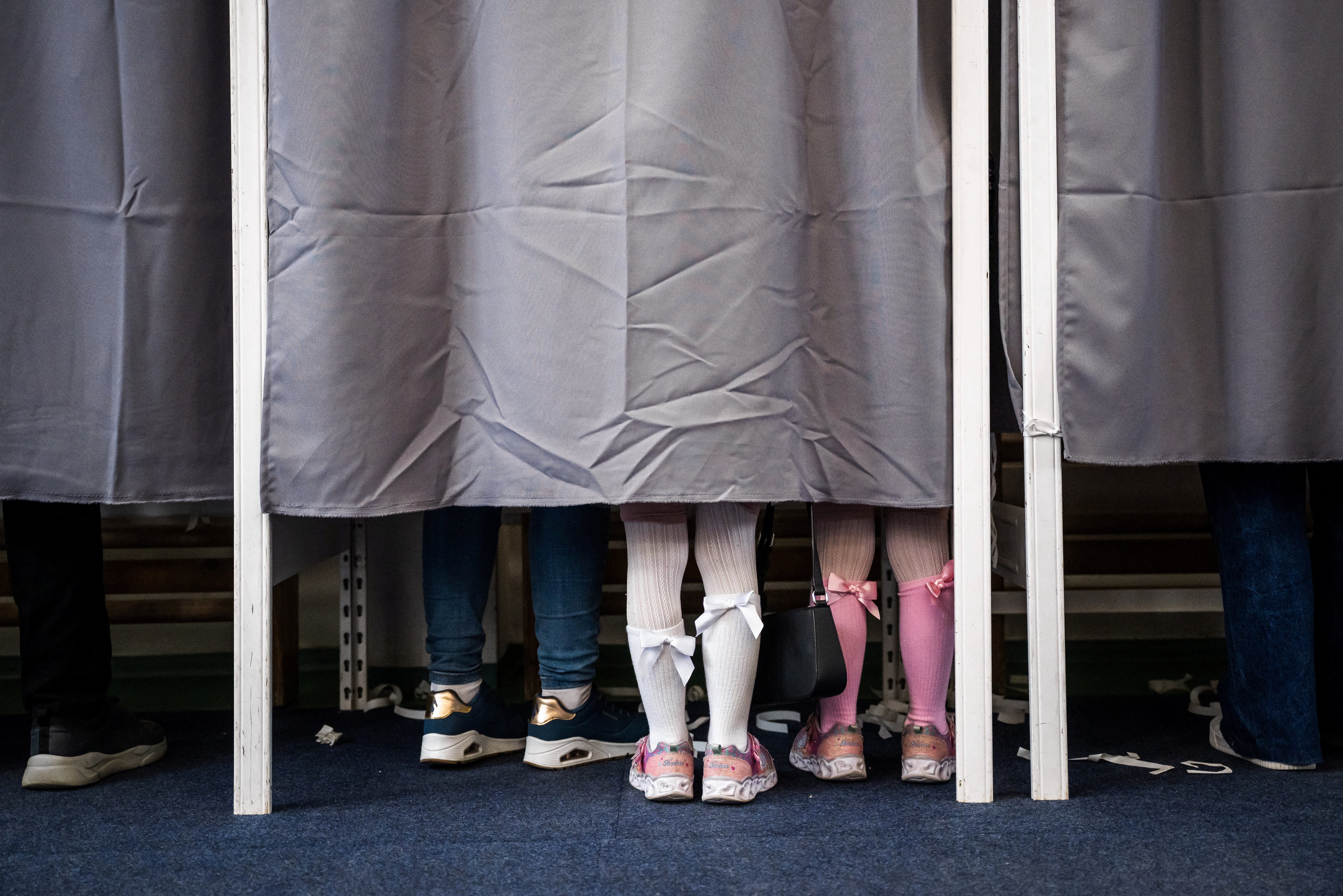 Los votantes y familiares hacen cola en un colegio electoral en Budapest, la capital húngara.