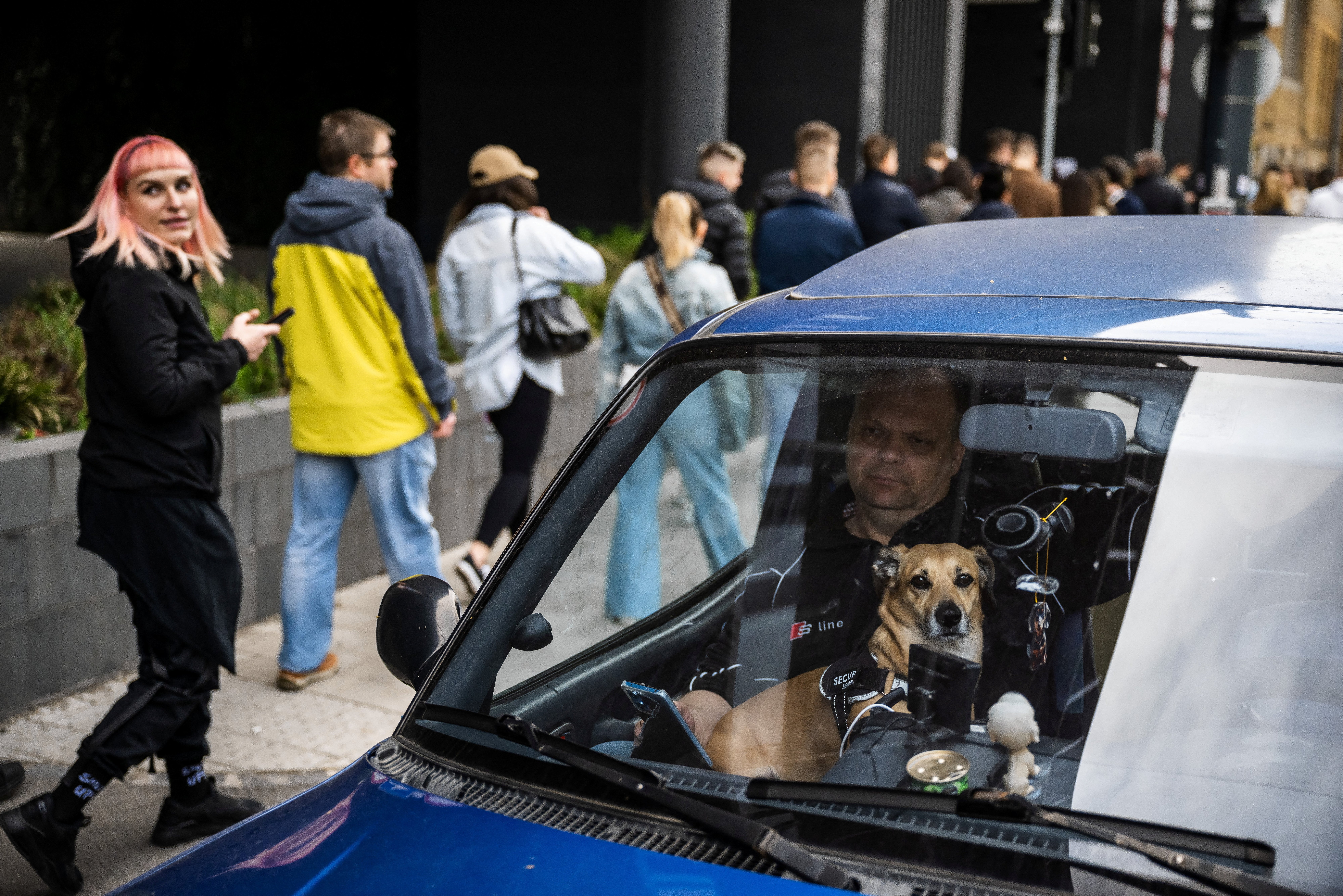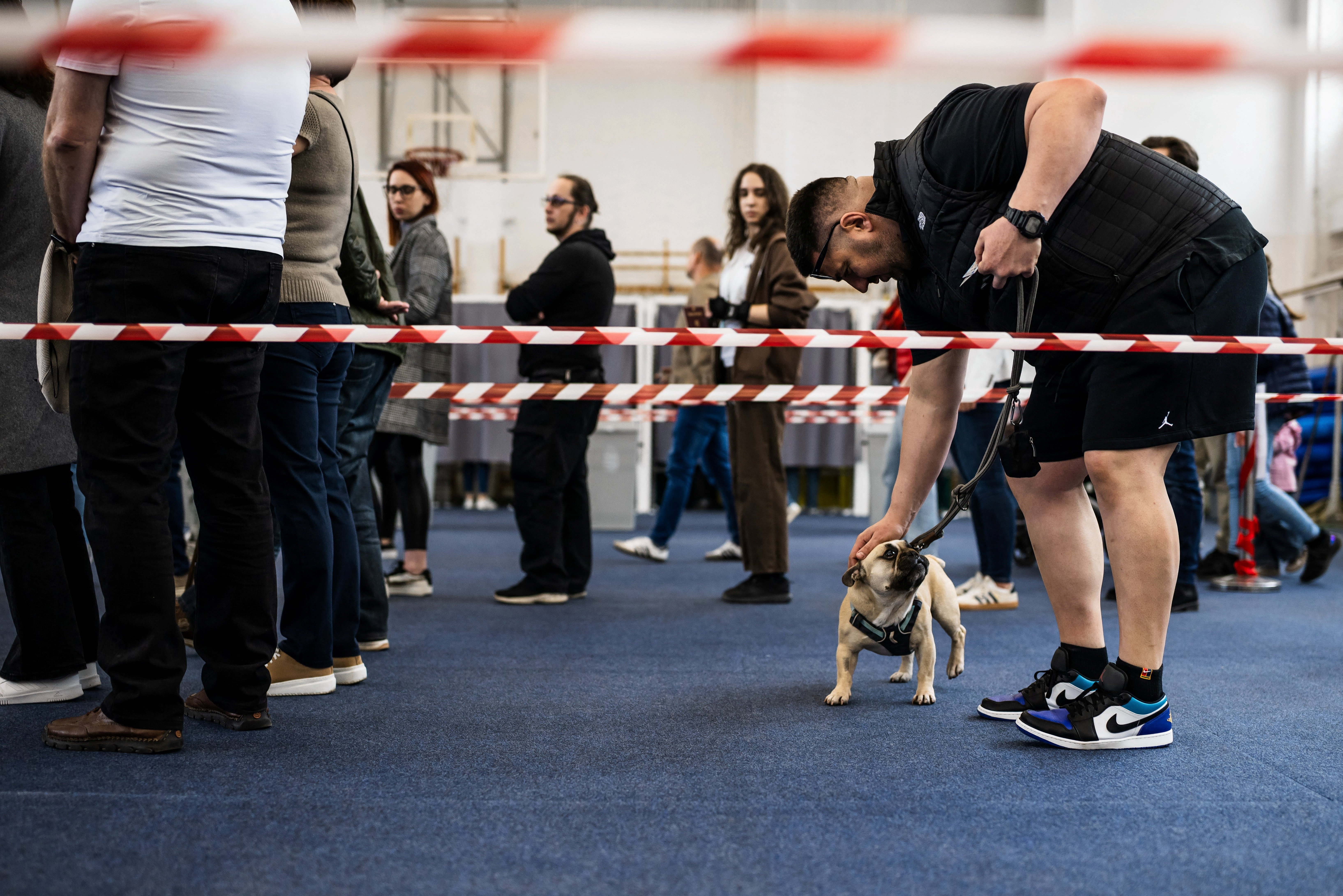 Un votante con una mascota en la cola en el colegio electoral de Budapest.