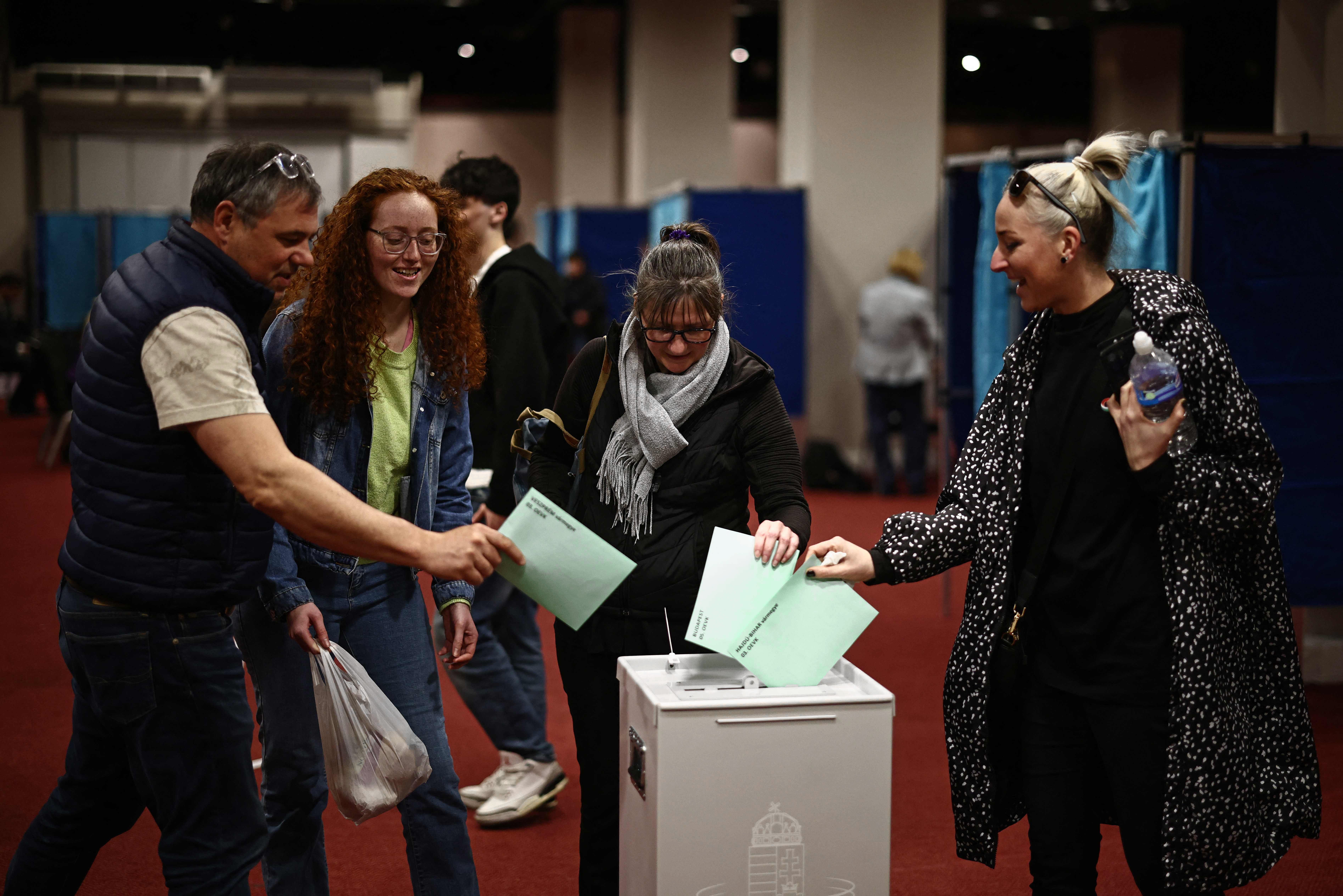 Electores en Budapest para las elecciones parlamentarias húngaras de este domingo.