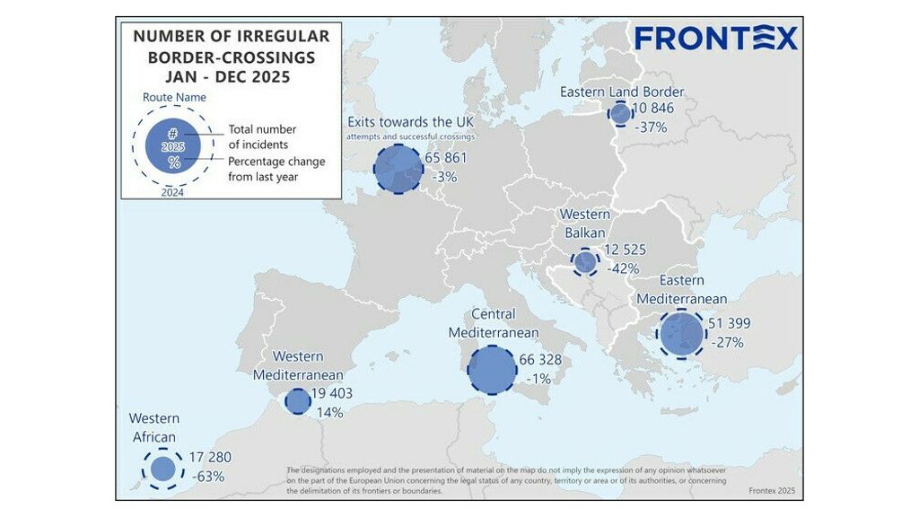 En 2025, casi 178.000 personas fueron interceptadas intentando entrar a la UE sin documentos, alrededor de un 26 por ciento menos que un año antes. También es menos de la mitad del total en 2023 y la cifra más baja desde 2021.