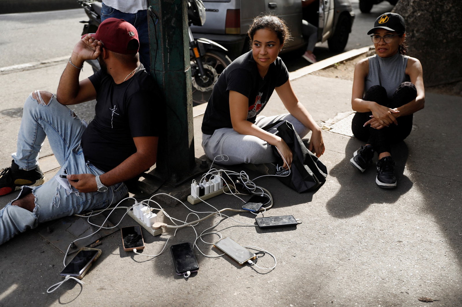 Después de las huelgas, la gente carga sus teléfonos en las farolas y hace cola para recibir comida.