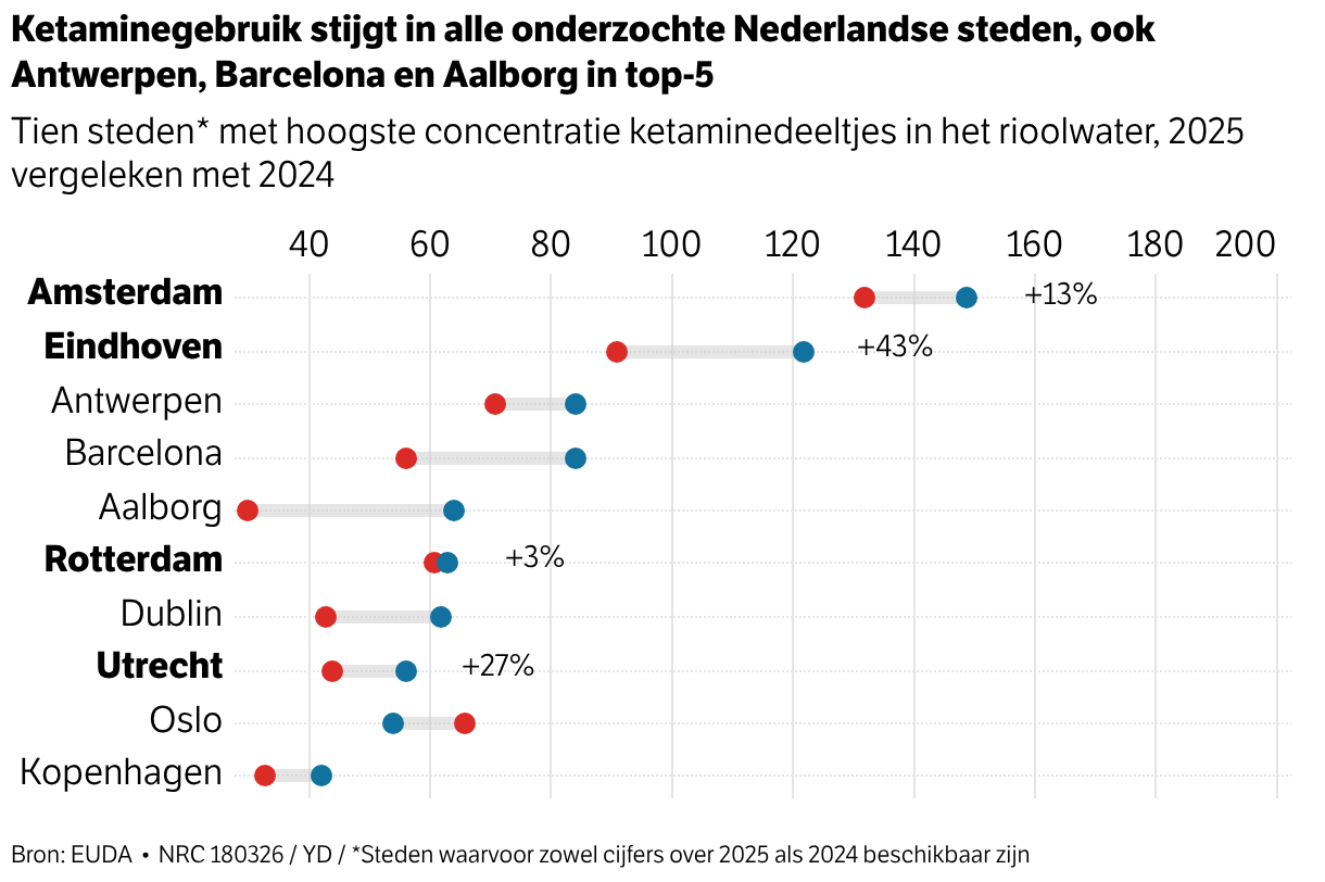 Así se desprende de los estudios sobre los residuos de medicamentos en las aguas residuales de las ciudades europeas, publicados el miércoles por la Agencia Europea de Medicamentos (EUDA). Cada año, la autoridad mide la cantidad de residuos de anfetamina, cocaína, metanfetamina (metanfetamina), MDMA, ketamina y cannabis en las aguas residuales de las ciudades europeas. Este año se realizaron mediciones en 130 ciudades de 28 países europeos. En los Países Bajos se realizaron mediciones en Rotterdam, Nieuwegein, Utrecht, Eindhoven y Amsterdam.